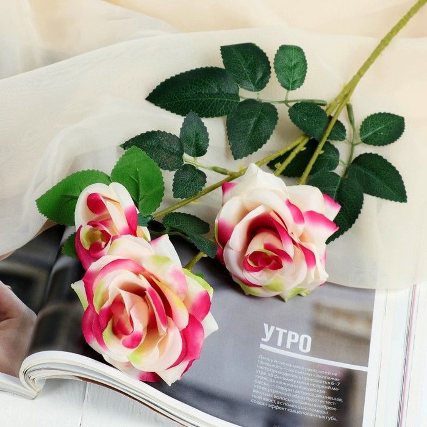 Цветы искусственные "Роза тройная" 6*61 см, бело-розовый 4301723