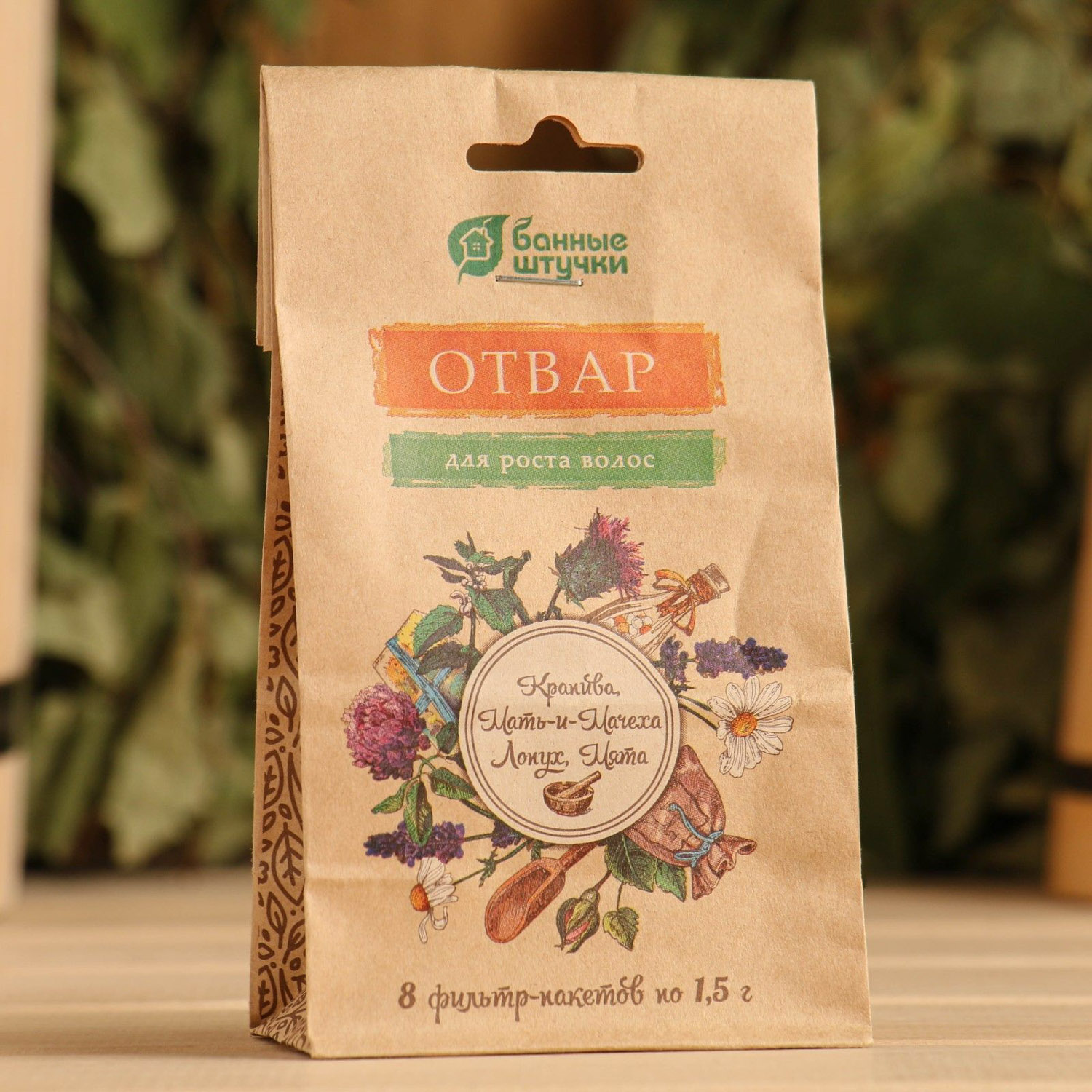 яяяОтвар для роста волос "Крапива, Мать-и-Мачеха, Лопух, Мята", 8 фильтр-пак. по 1,5г. "Банные штучки"/ 20