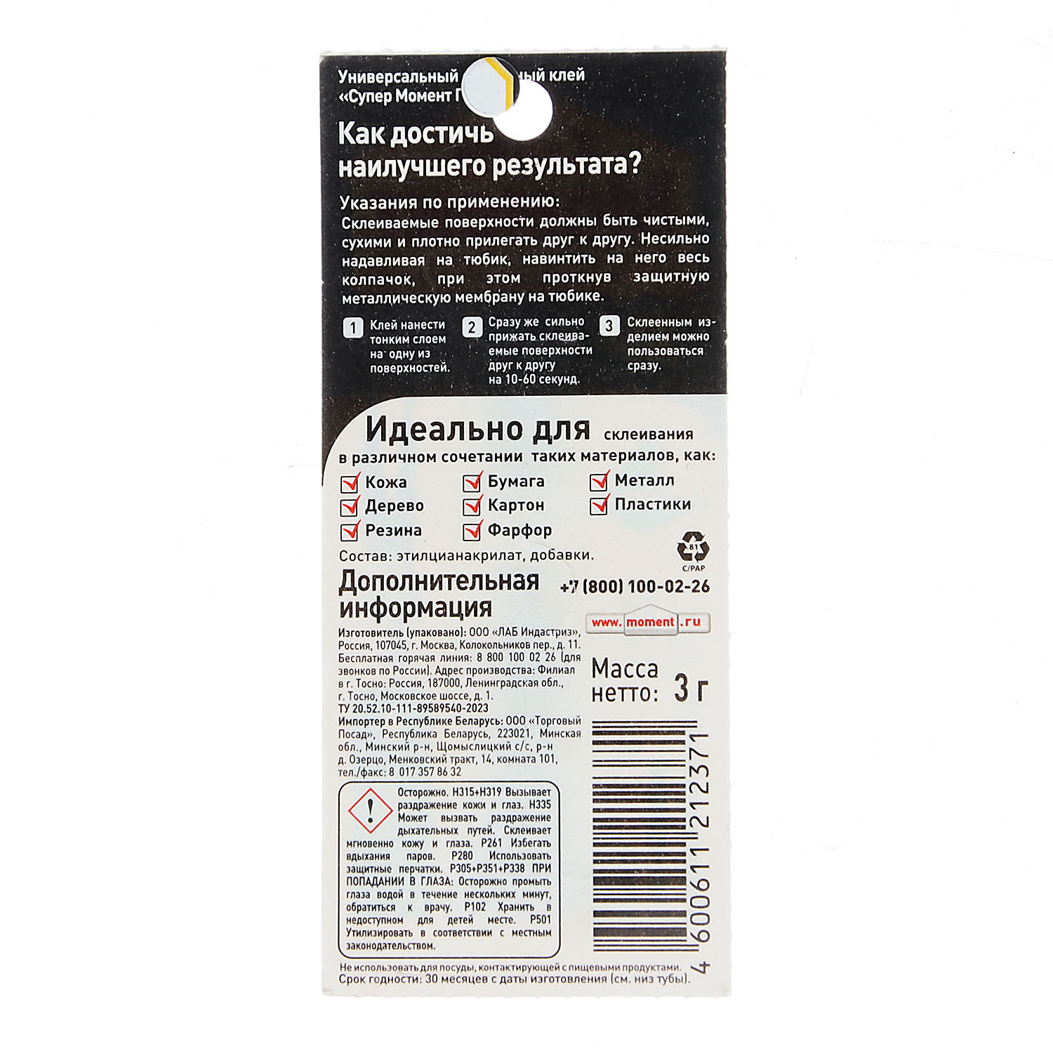 Для склеивания различных материалов, например, стекла, фарфора, кожи, керамики, дерева, резины, металла, пробки, картона и других.