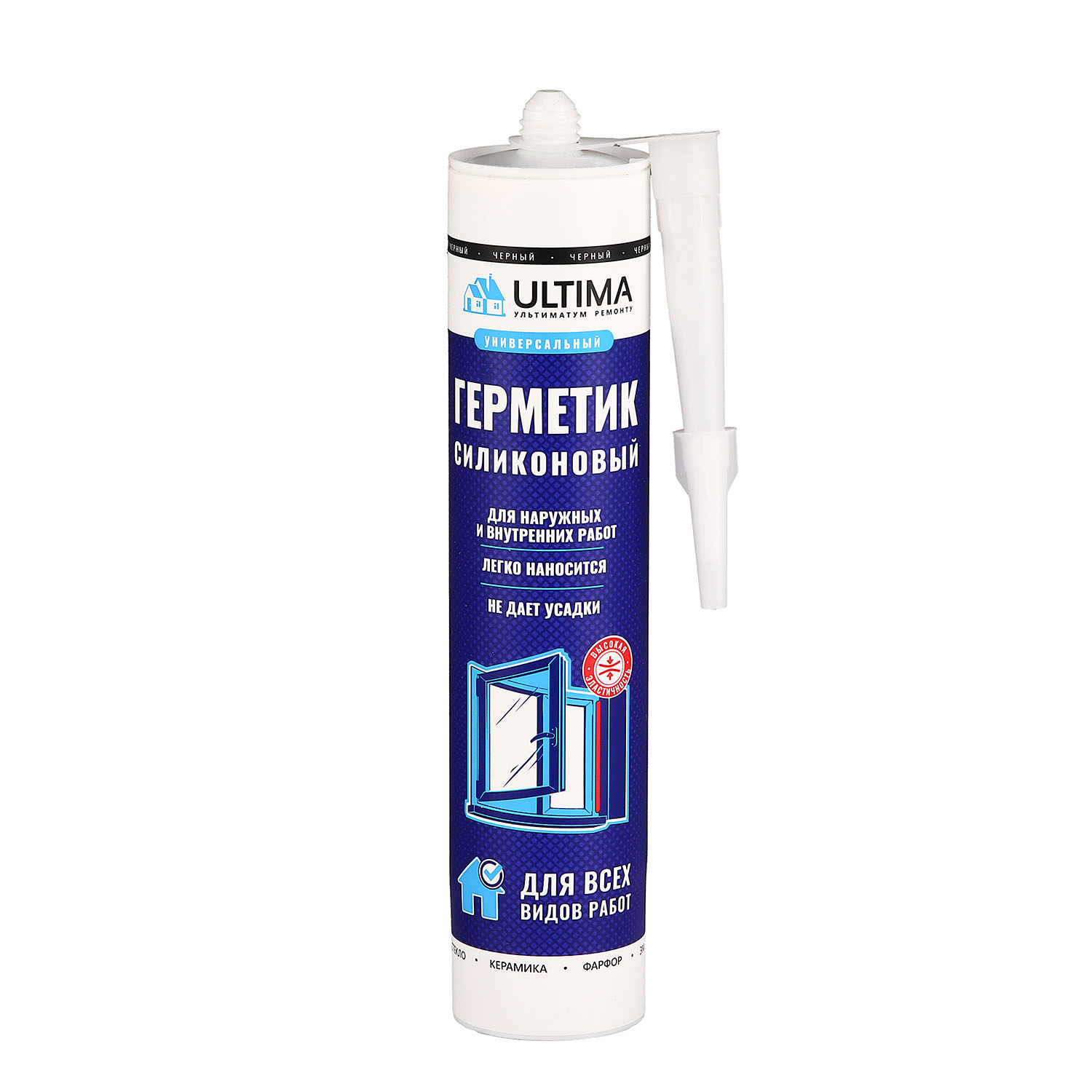 ULTIMA Universal Silicone черный — универсальный силиконовый кислотный герметик для стыковых и расширительных соединений внутри и снаружи помещений. Используется для уплотнения, соединения и защиты непористых поверхностей от проникновения воздуха и влаги, герметизации оконных рам, дверных коробок, витрин, стендов, панелей. Обладает хорошей адгезией к следующим материалам: стекло, керамика, кафель, фарфор, эмаль, пластик, полиэстер, алюминий, нержавеющая сталь, лакированное дерево, МДФ, ламинат.