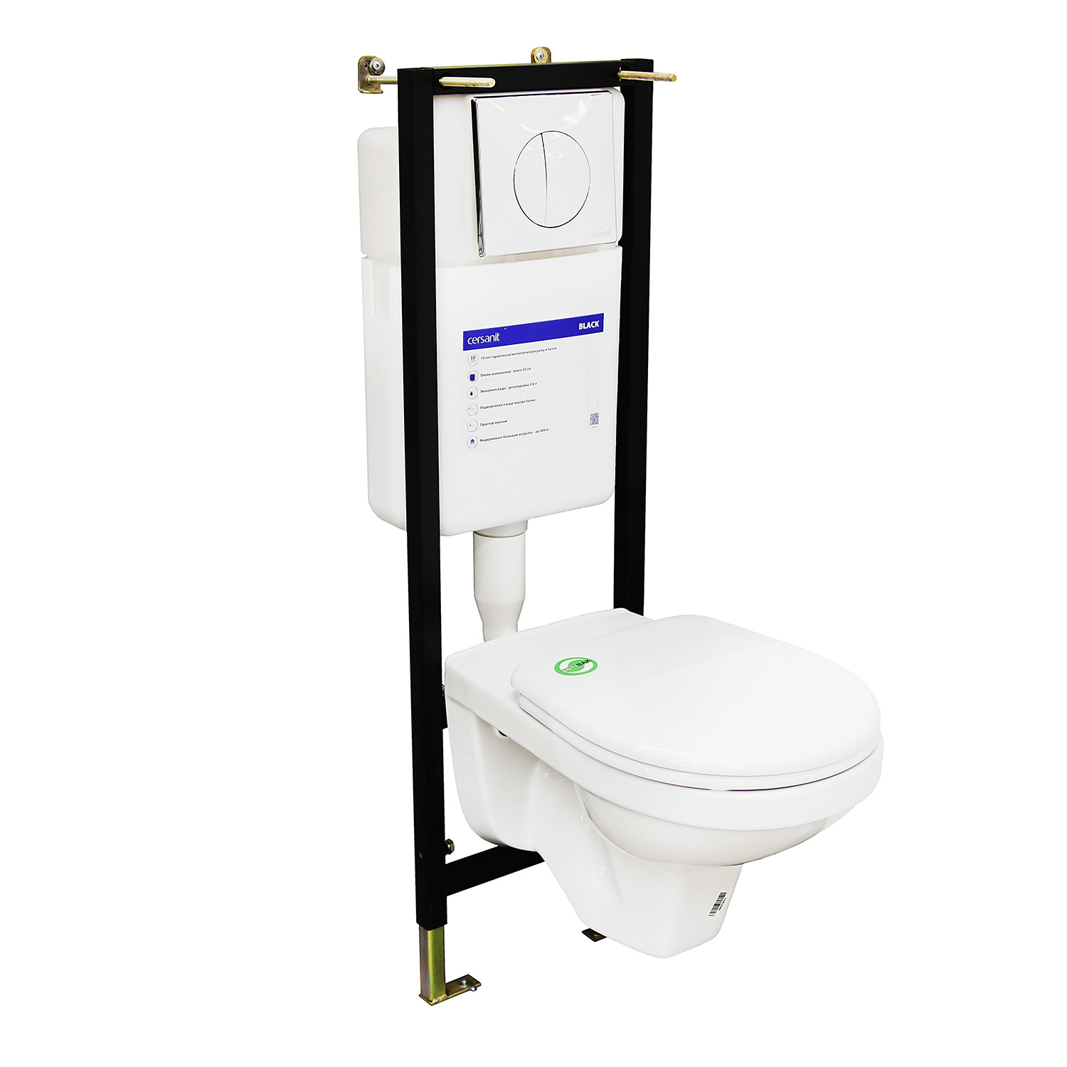 Комплект PARVA Clean On с ультратонким антибактериальным сиденьем из дюропласта с функцией плавного закрывания и легкосъемом, с инсталяцией BLACK и пластиковой кнопкой смыва LEON.