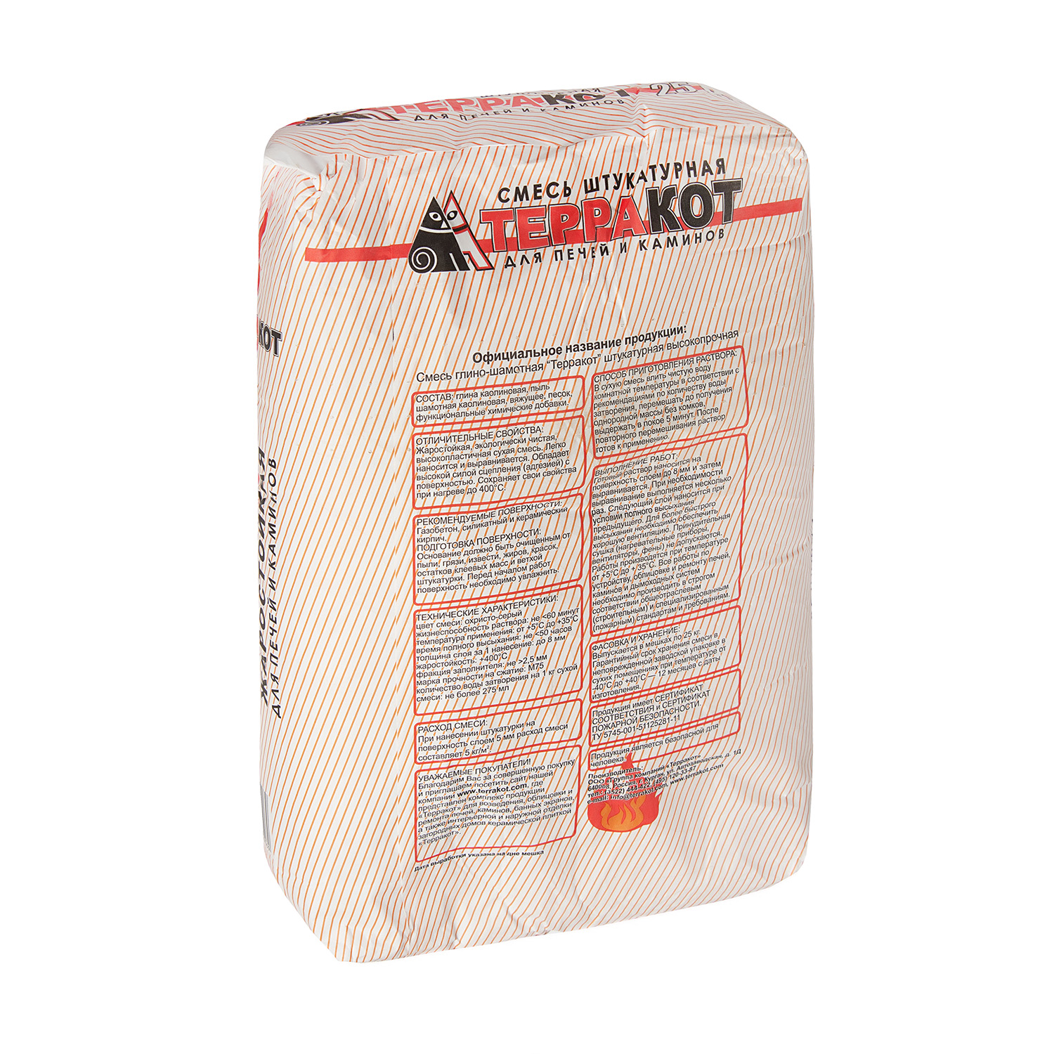 Штукатурка жаростойкая Терракот — экологически чистая, высокопластичная сухая смесь. Легко наносится и выравнивается. Обладает высокой силой сцепления (адгезией) с поверхностью. Жаростойкость штукатурки составляет 400 °С. Марка прочности на сжатие: М75.