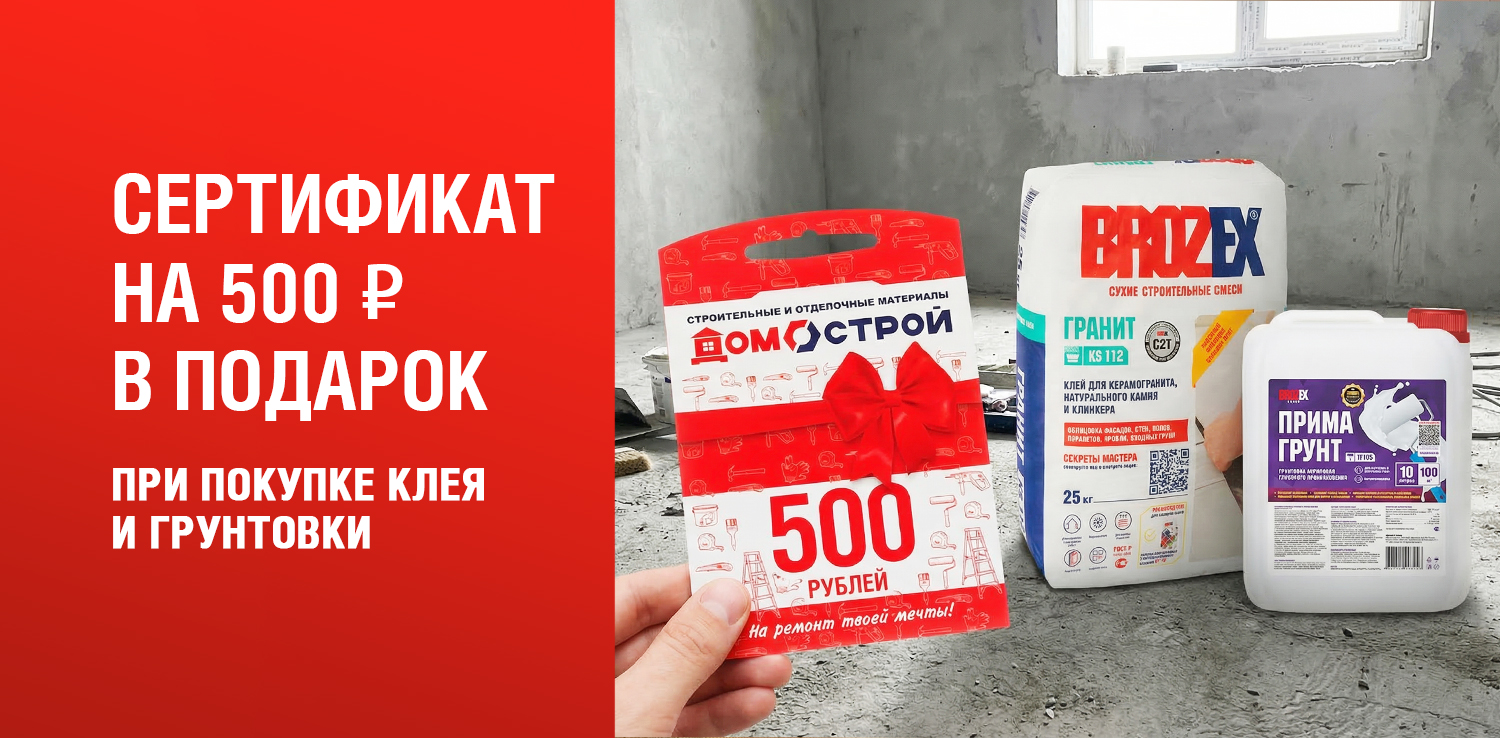 С 10 марта по 31 мая в ДомоСтрой — выгодное предложение! При покупке комплекта: 4 мешка клея + 1 канистра грунтовки вы получаете подарочный сертификат ДомоСтрой номиналом 500 рублей. Подарок кратен количеству комплектов (8+2 = 2 сертификата и т.д.).