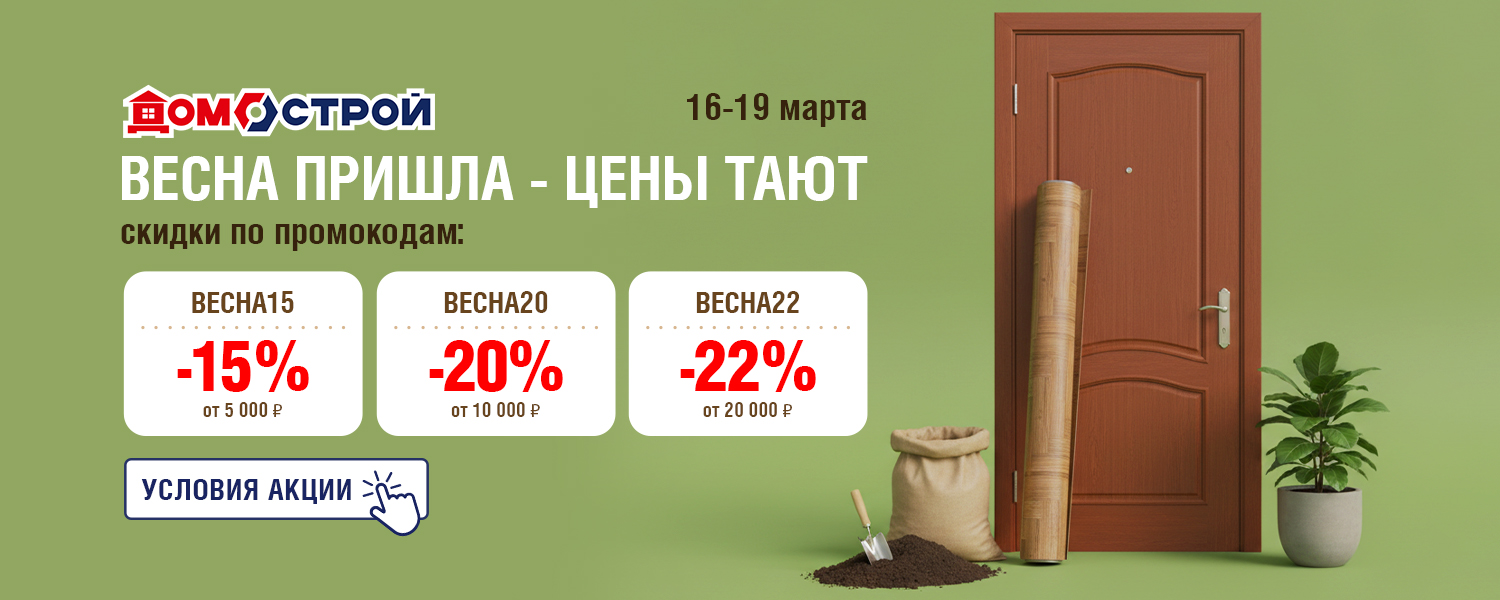 С первыми тёплыми днями хочется перемен. Обновить пространство, добавить уюта, наконец-то заняться тем, что откладывалось всю зиму. Весна — идеальное время для нового старта, особенно когда перемены начинаются с дома. Поэтому на сайте ДомоСтрой с 16 по 19 марта действует акция с прогрессивной скидкой — чем больше сумма покупки, тем выше экономия: